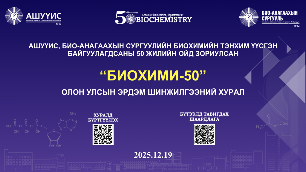 Анагаахын Шинжлэх Ухааны Үндэсний Их Сургуулийн Био-Анагаахын Сургуулийн Биохимийн тэнхим байгуулагдсаны түүхт 50 жилийн ойд зориулсан “БИОХИМИ – 50” олон улсын эрдэм шинжилгээний хуралд таныг урьж байна.